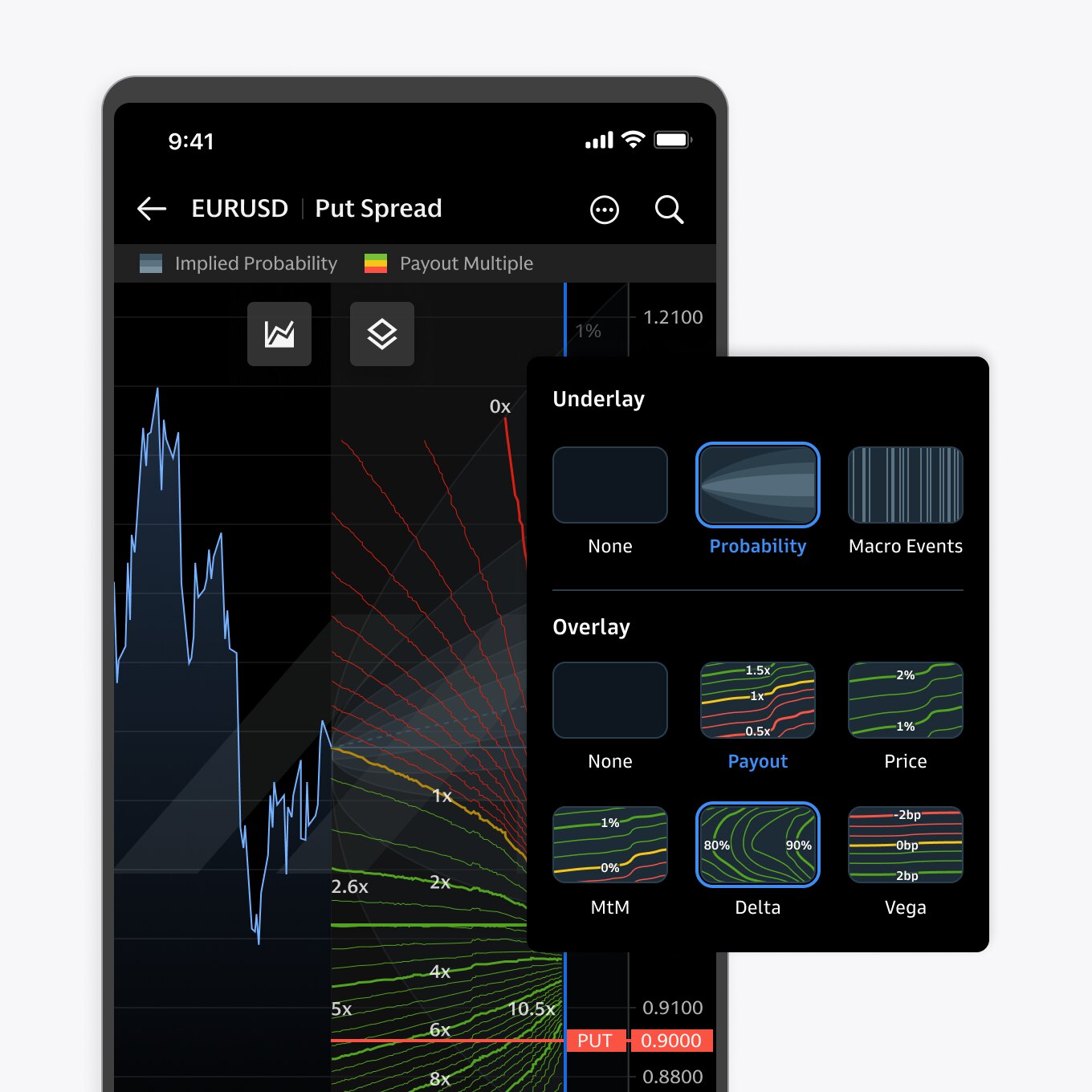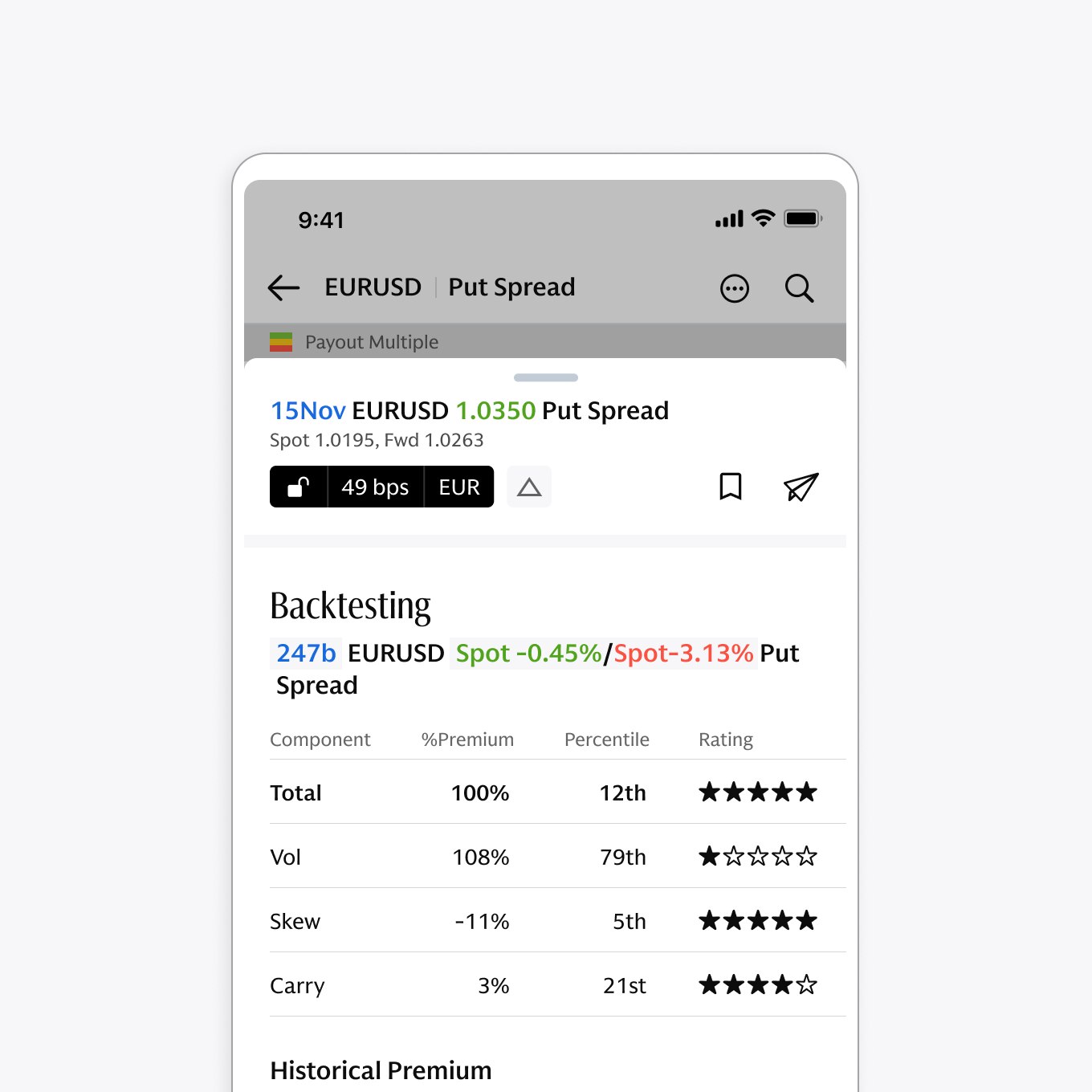 Stress test your idea by swiping the chart up to visualize premium and payout to analyze the relative historical price value. Don’t just solve for one structure at a time, set your target premium and rapidly get as many variations as you need.