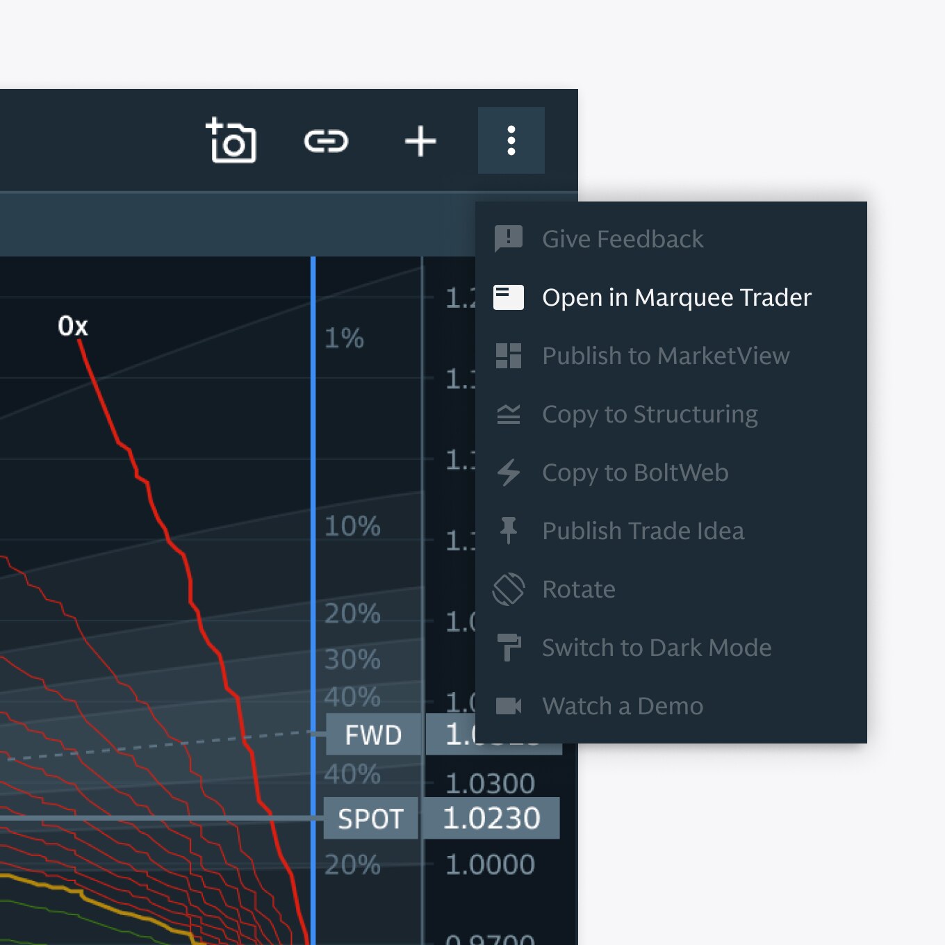 For FX or Equity options, you can launch a request for live pricing directly from Visual Structuring by clicking “Open in Marquee Trader” from the three dots at the top right of your chart.