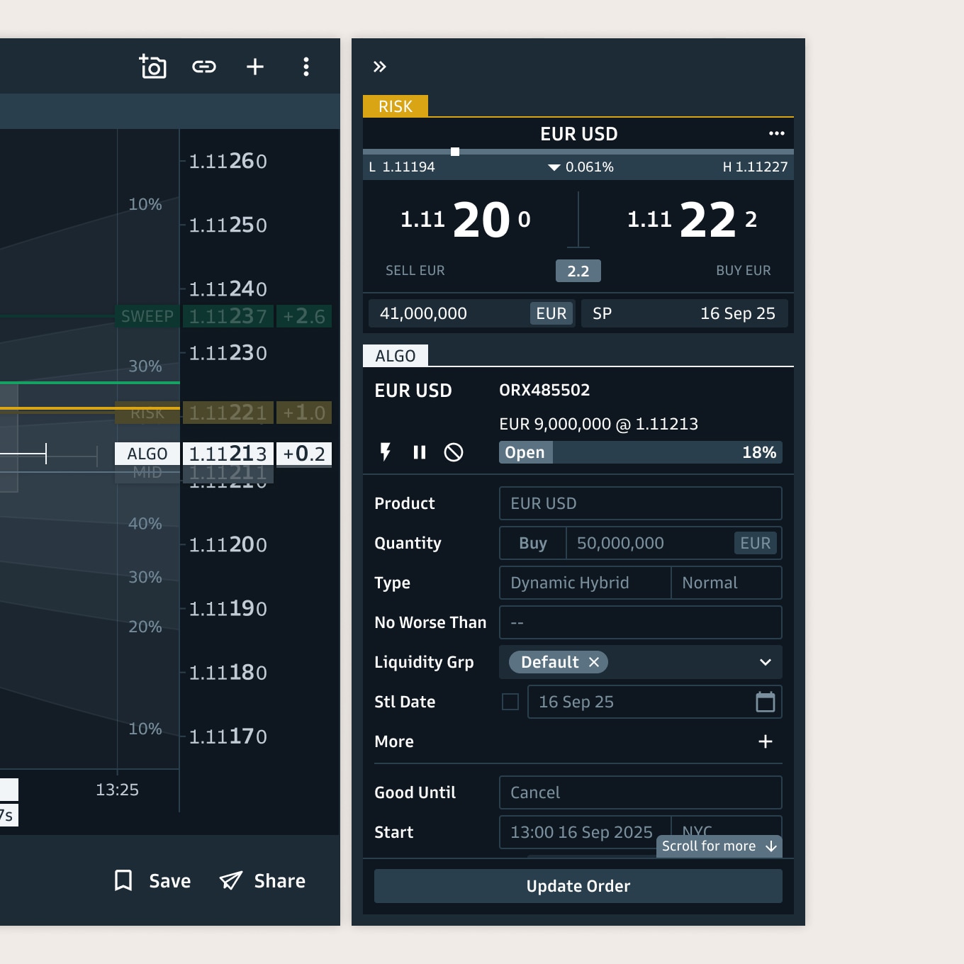 Real-time order monitor on algo fills and updated reference prices for the remaining amount allowing you to adapt parameters mid-trade, or pivot strategy as liquidity shifts.