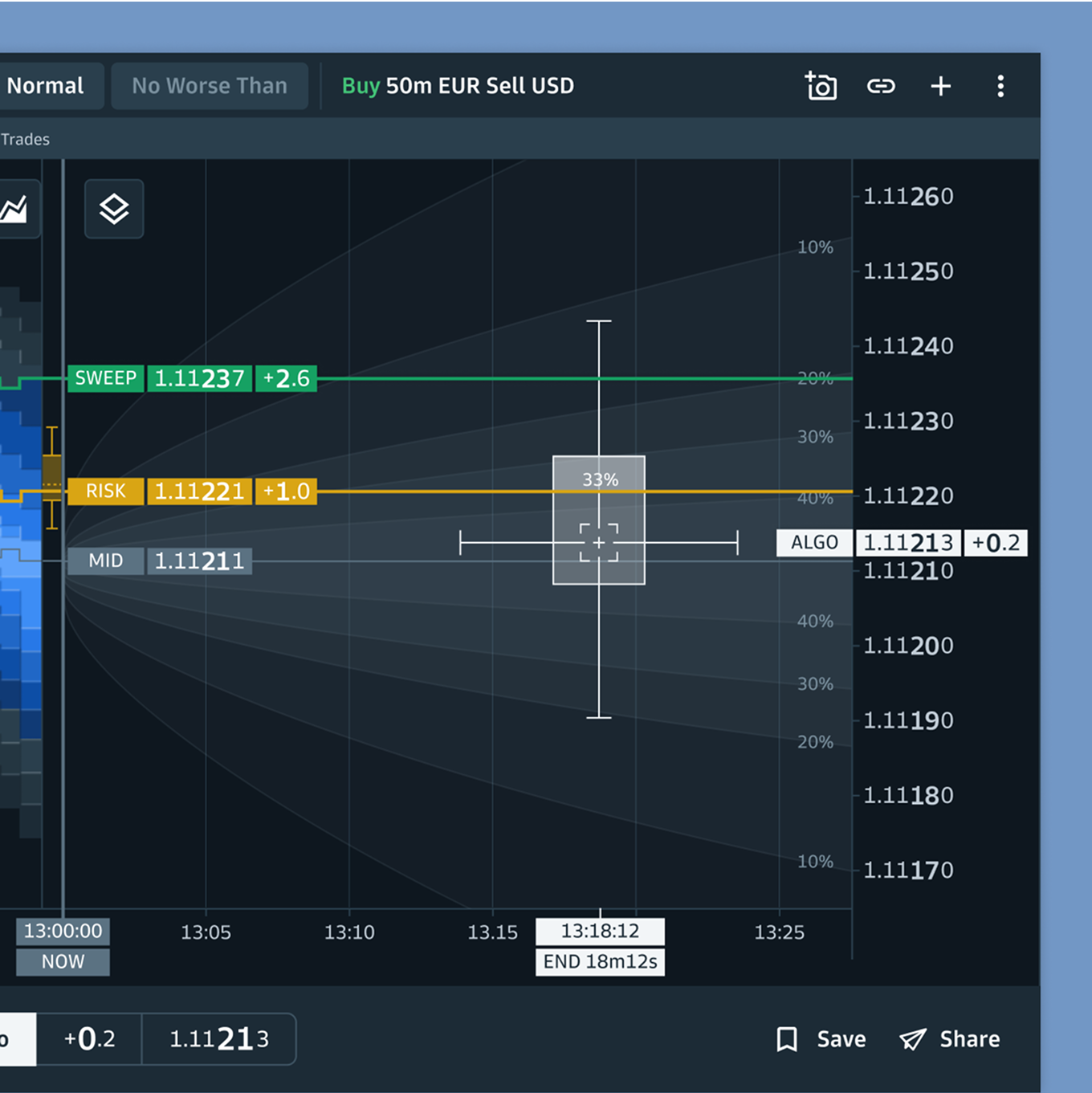 Easily compare scenarios and pricing for whether it’s best to sweep the order book, trade the Goldman Sachs risk transfer price, or use the Algo – all in a single chart view.